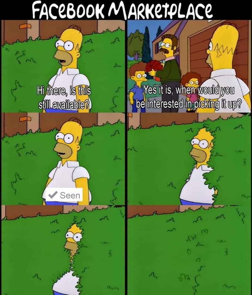 Why anyone still uses that trash website is beyond me. The fact that their absolute dog shit “Marketplace” killed the beautiful List of Craig will never not infuriate me. I've used my wife's account to try to sell stuff on Facebook Marketplace. It's just a giant gathering of the dumbest, flakiest asshats in my area. Underneath the marketplace banner it should list the official slogan of that Godless hellscape, "Is this still available?"